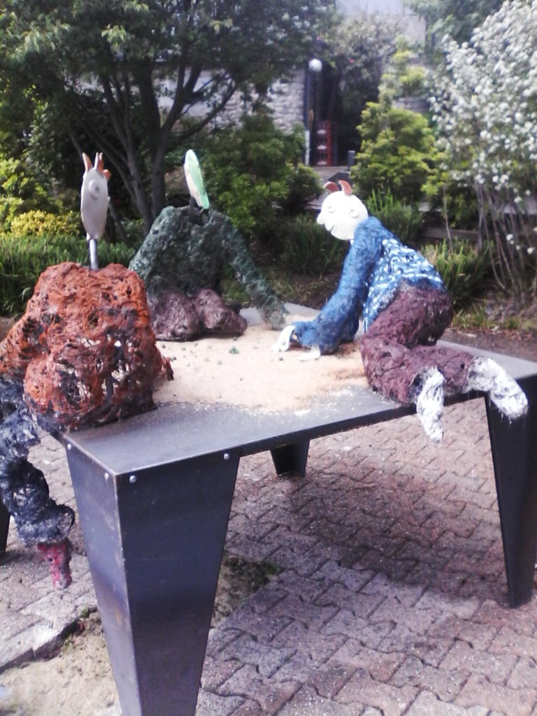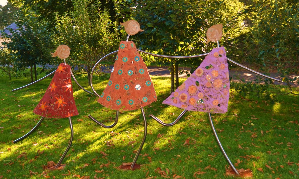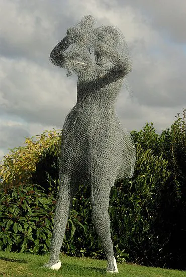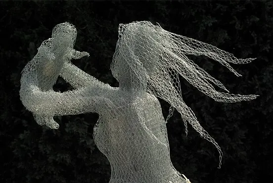 sculpture en grillage, le cœur de l'enfant et de la maman sont en porcelaine, hauteur 1,70m